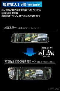 広い視界と自然な距離感を両立させた3000SR緩曲面鏡を採用。横方向はもちろん縦方向にも視界が広がり、ゆとりのあるドライビングに貢献します。