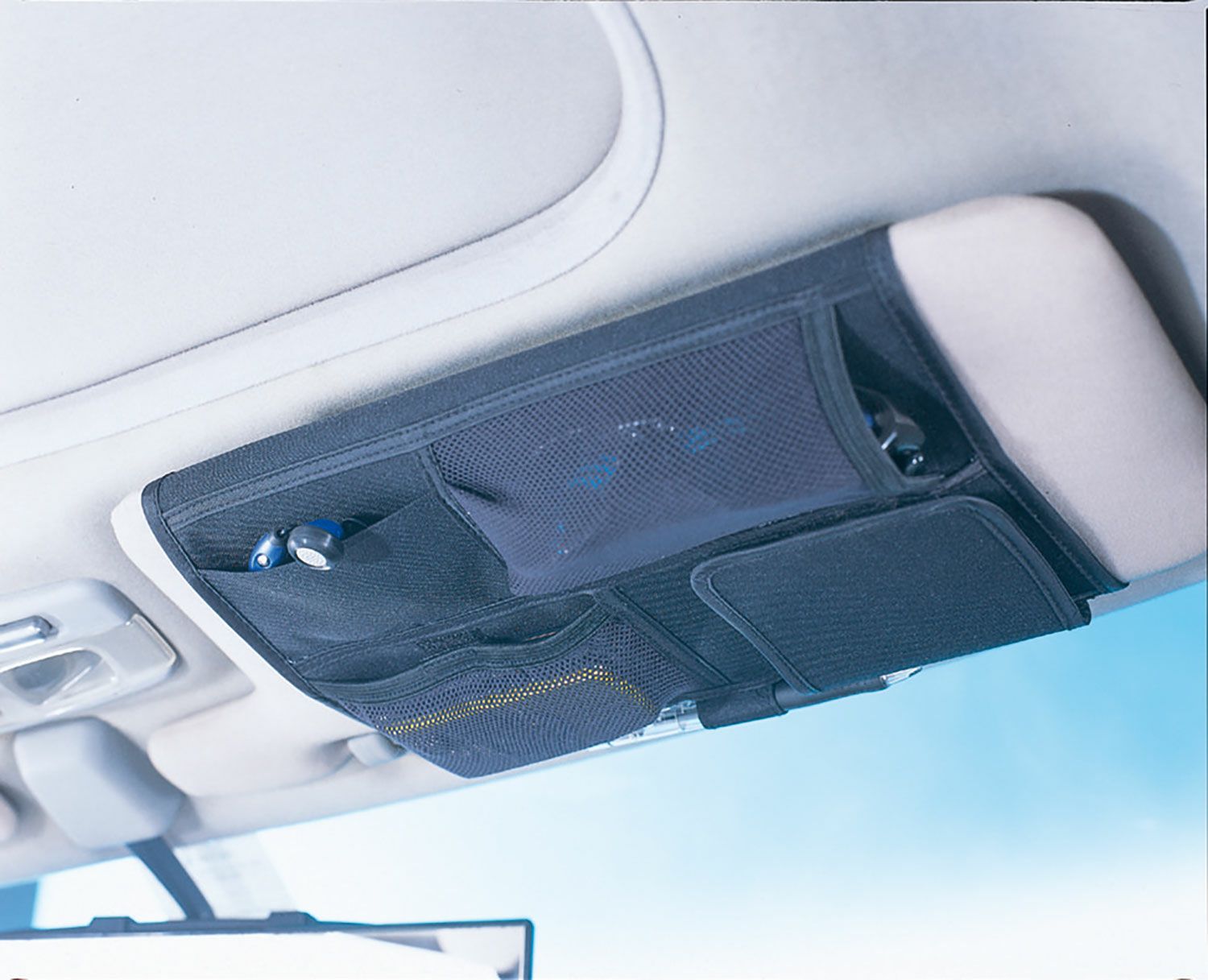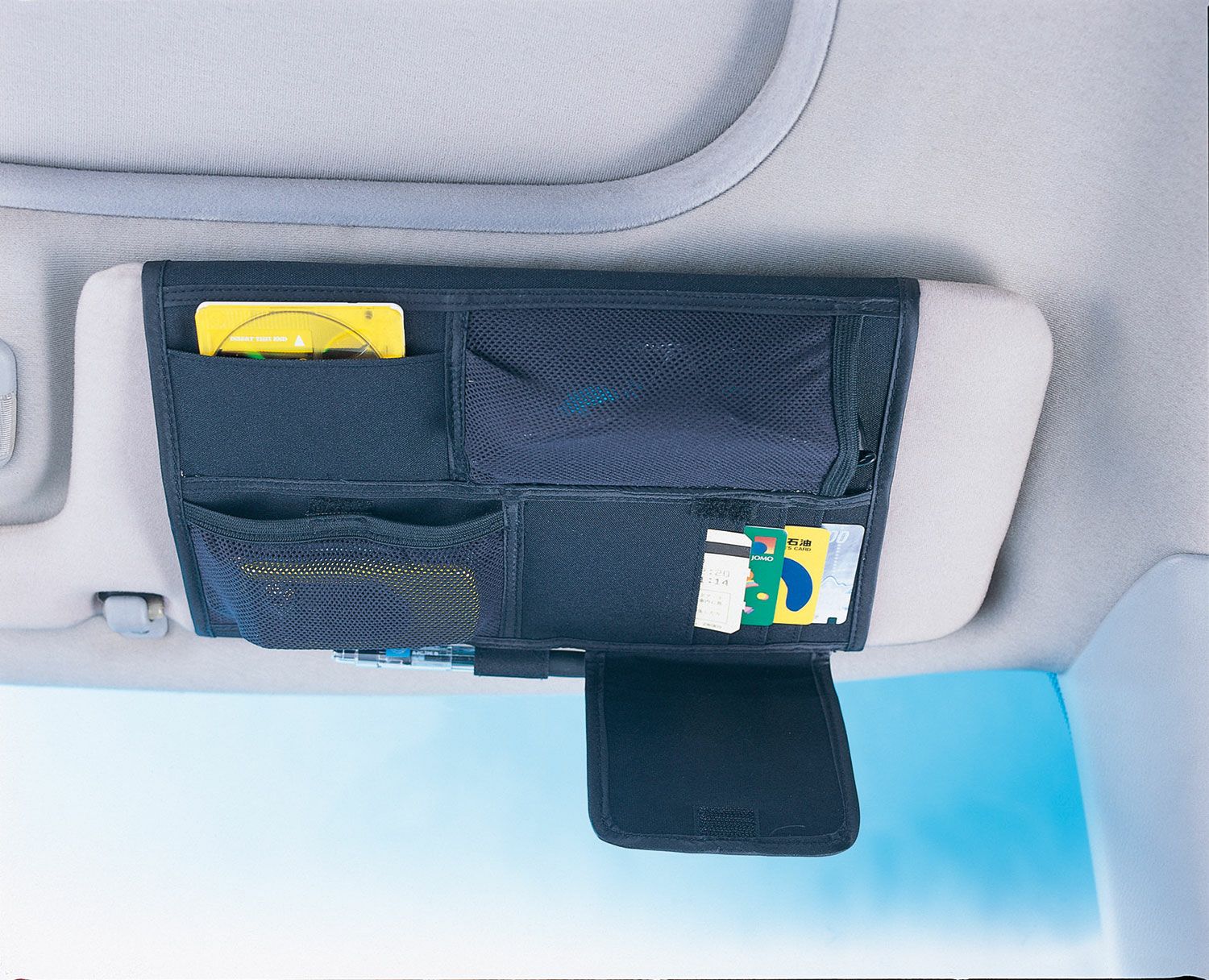 全周50cmの大型バイザーにも取付けできるバイザーポケット。スマートフォンやサングラス、カード4枚、小物等のドライブグッズを収納できます。カード部分はフタ付なので盗難予防にもなります。