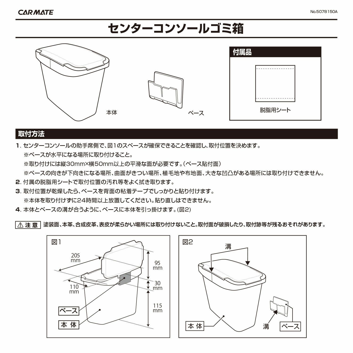 接着面のゴミ・ホコリ・油分等を取り除く脱脂用シートを付属しています。脱脂用シートでセンターコンソールを掃除してからベースの粘着テープを貼り付けることで接着性を高めることができます。