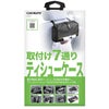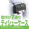 ヘッドレスト、シートバック、バイザー、アームレスト等いろんな場所・パターンで取付けできるティシューケース。ウェットティシューなどの小物が入れられるポケット付き。