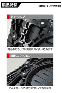 アイスバーンで特に有効な「超硬スパイクピン」で強力なグリップ力を発揮。(スパイクピンは直接タイヤに接しない設計になっています)