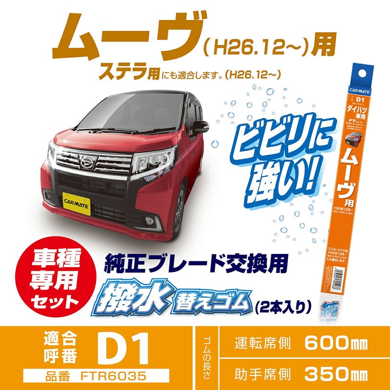 業界初!純正フラットワイパー用撥水替えゴムの車種別専用セット。ダイハツ・ムーヴの純正フラットワイパー用撥水替えゴム。運転席側・助手席側の2本セット。品名 FTR6035 HYDROPHOBIC RIFILL