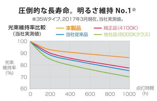 明るい光でもすぐに暗くなってしまっては意味が無い。H.I.D.は家庭用の蛍光灯と同様、