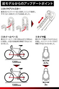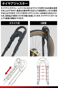 専用のタイヤアジャスターは2分割する機構になっており、小径車も最適な位置でホールドすることが可能です。
