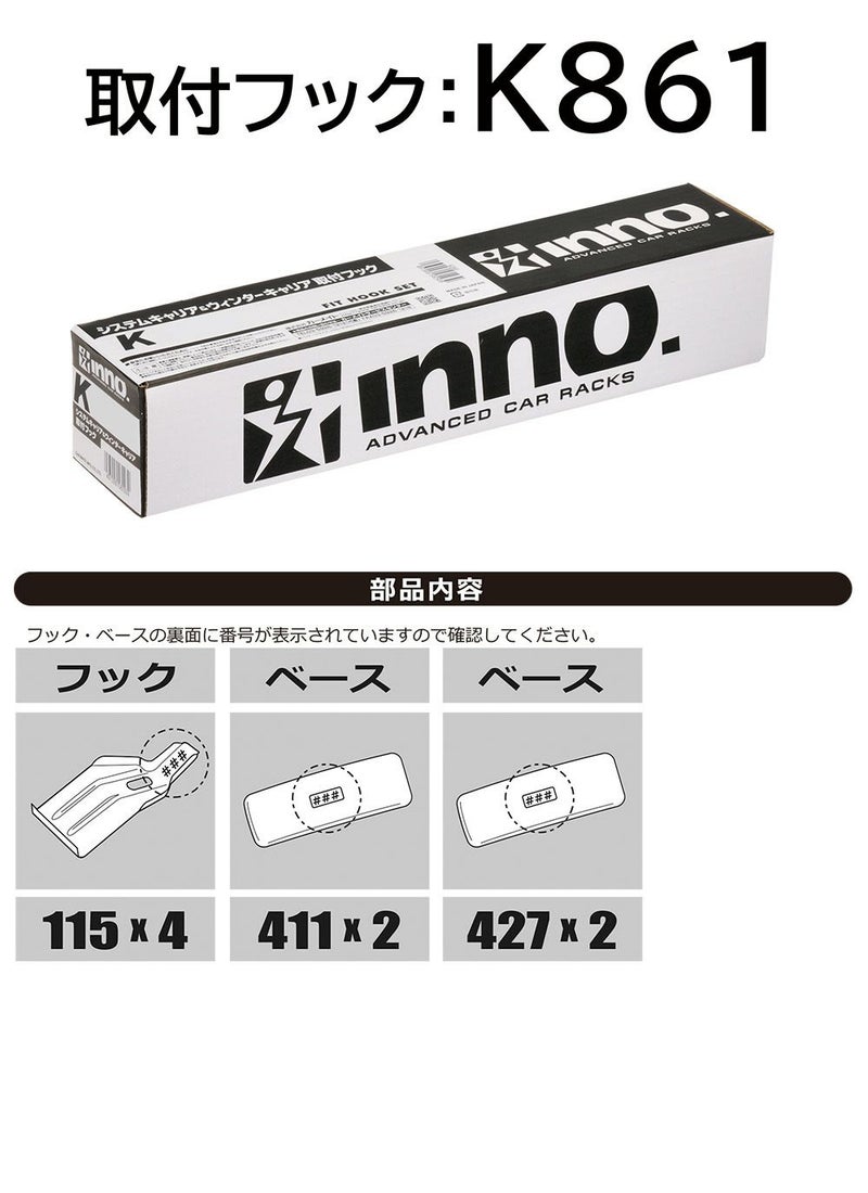 INNOベースキャリアの取付けに必要な車種別の取付フックです。