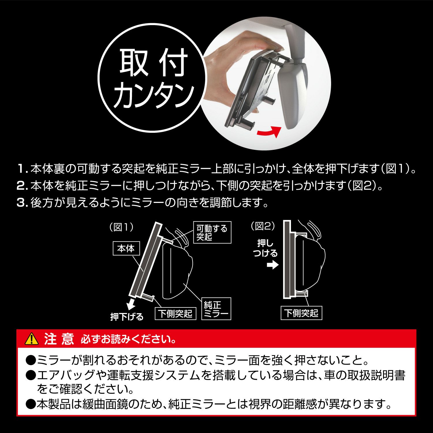 ・平面鏡の「自然な距離感」と曲面鏡の「ワイドな視界」の両方を持ち合わせた本当に見やすいミラーです。