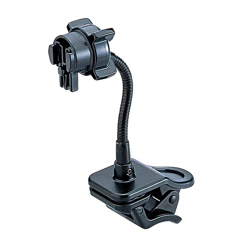 別売の「ホルダー」と組合せて使うクリップタイプのベースです。車内・オフィス・自宅等いろいろな場所で使えます。フレキシブルアームと結合部のボールジョイント構造で、ホルダー(別売)の角度や向きを調節できます。