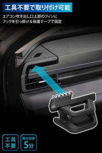 エアコン吹き出し口上部のフィンにフックを引っ掛け&両面テープでしっかりと貼り付けます。工具不要で、簡単に取り付けることができます。