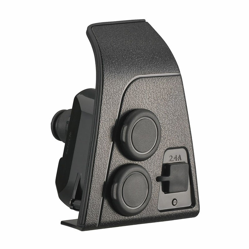 ハスラー専用なので内装にマッチするデザインの増設電源。カーソケット×2口(合計7A)+USB×2ポート(合計2.4A)でハイパワー充電が可能。粘着テープで貼付けるだけの簡単取付。