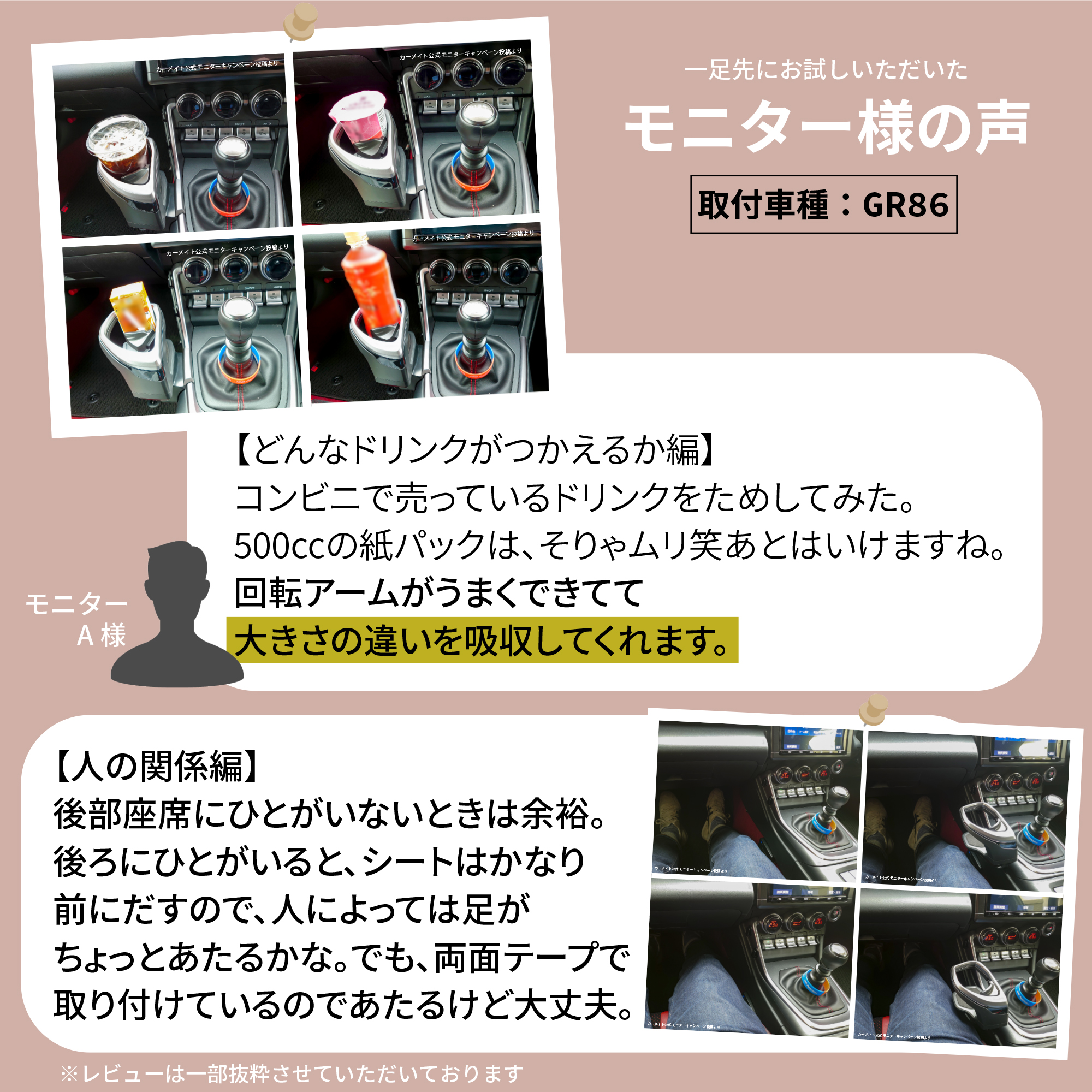 【どんなドリンクがつかえるか編】 コンビニで売っているドリンクをためしてみた。 500ccの紙パックは、そりゃムリ笑 あとはいけますね。 回転アームがうまくできてて大きさの違いを吸収してくれます。 【人の関係編】 後部座席にひとがいないときは余裕。 後ろにひとがいると、シートはかなり前にだすので、人によっては足がちょっとあたるかな。 でも、両面テープで取り付けているのであたるけど大丈夫。 取付車種 : GR86 ※レビューは一部抜粋させていただいております。