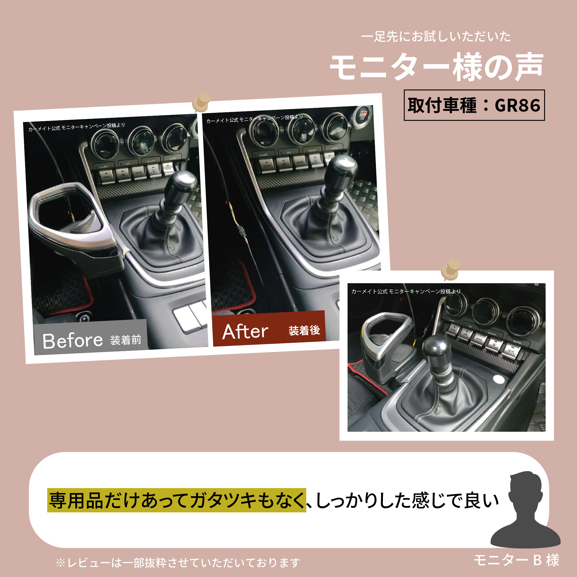 専用品だけあってガタツキもなく、しっかりした感じで良い。 取付車種 : GR86 ※レビューは一部抜粋させていただいております。