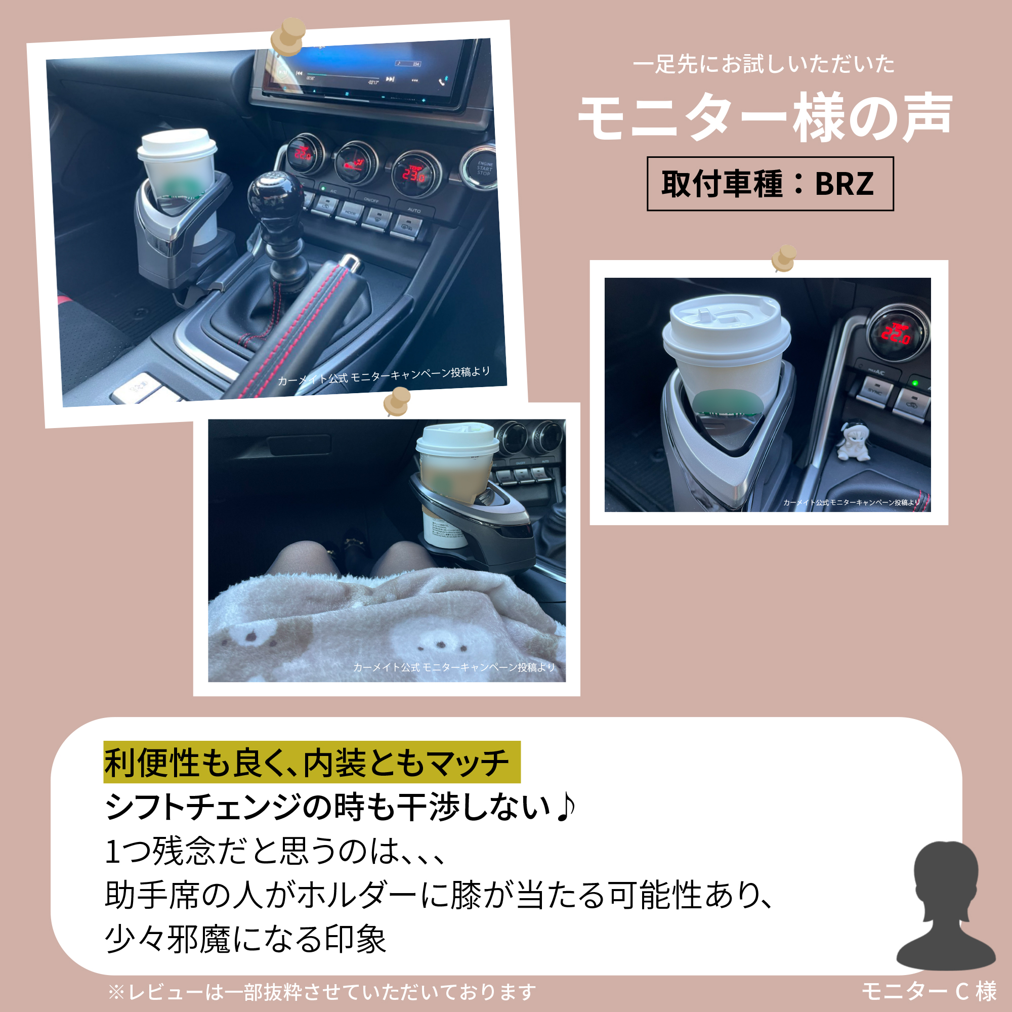 利便性も良く、内装ともマッチ シフトチェンジの時も干渉しない♪ 1つ残念だと思うのは、、、 助手席の人がホルダーに膝が当たる可能性あり、少々邪魔になる印象。 取付車種 : BRZ ※レビューは一部抜粋させていただいております。