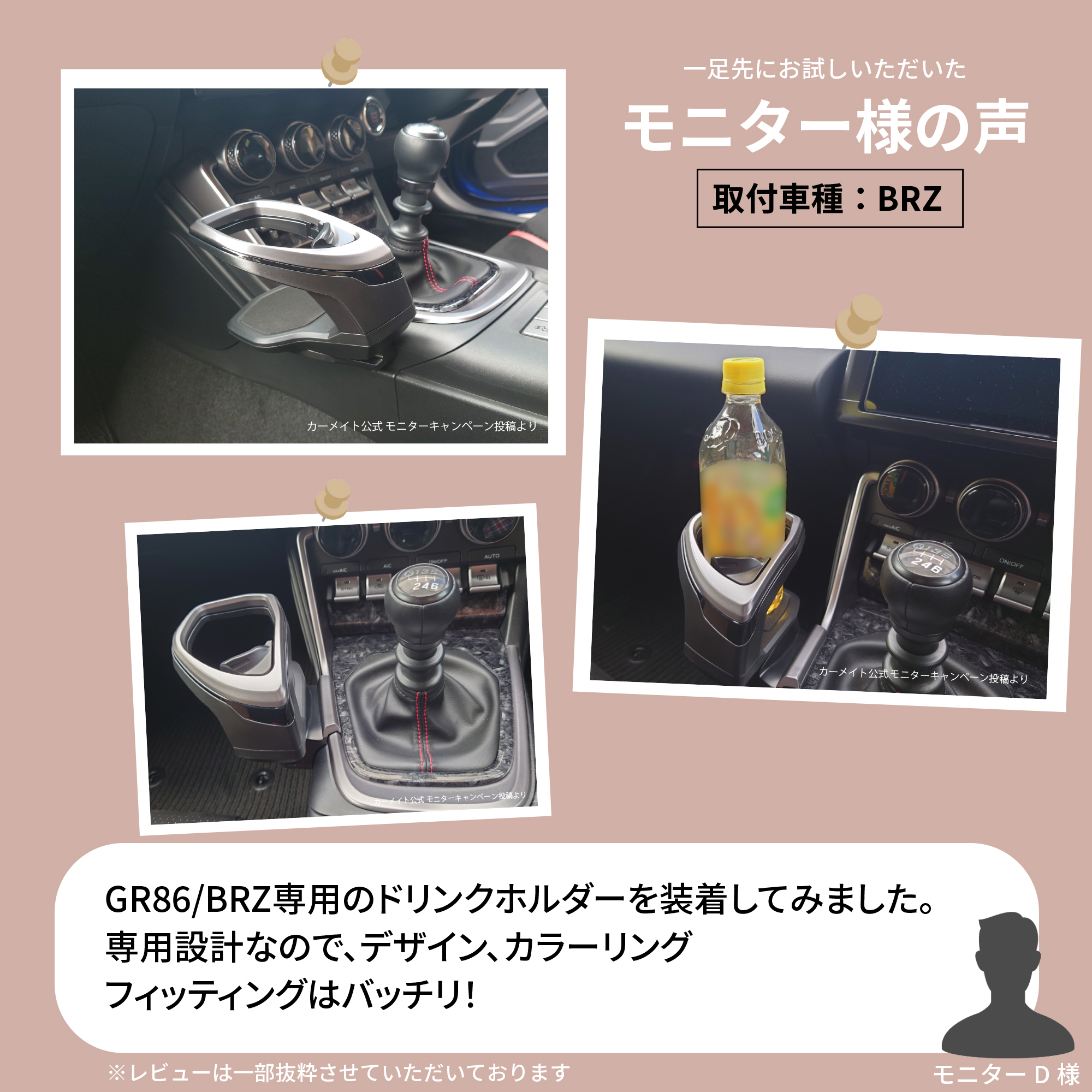 GR86/BRZ専用のドリンクホルダーを装着してみました。 専用設計なので、デザイン、カラーリング、フィッティングはバッチリ! 取付車種 : BRZ ※レビューは一部抜粋させていただいております。