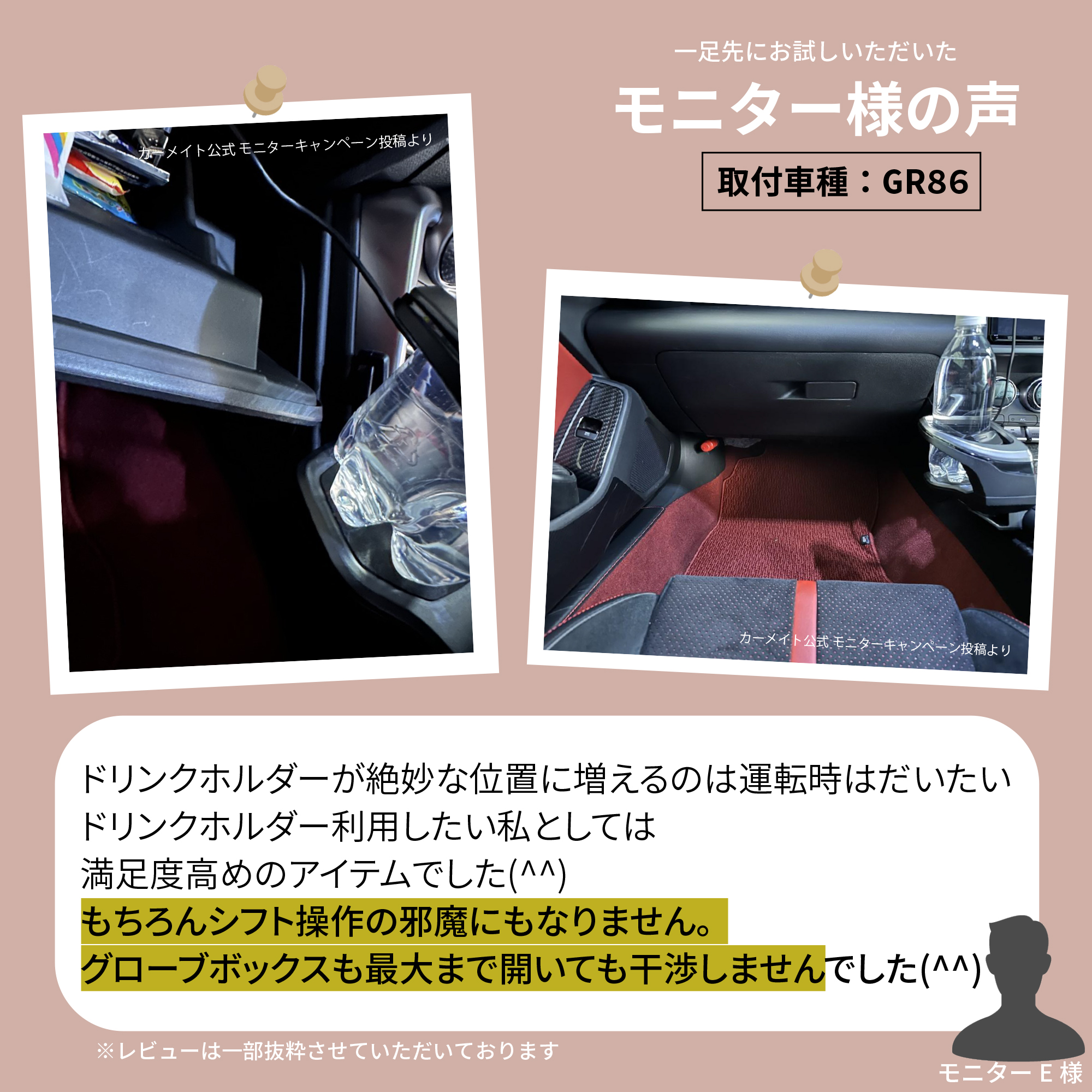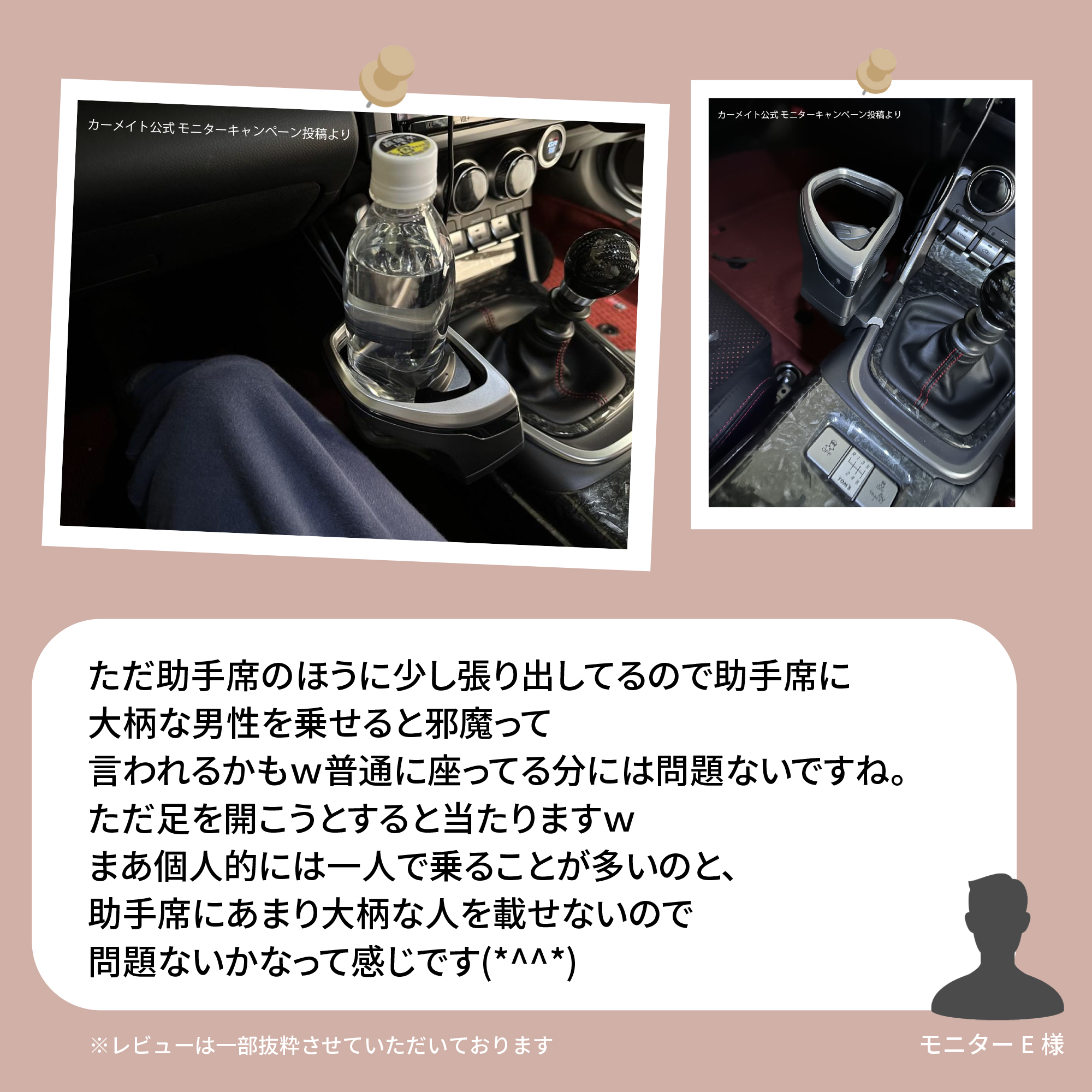 ドリンクホルダーが絶妙な位置に増えるのは運転時はだいたいドリンクホルダー利用したい私としては満足度高めのアイテムでした(^^) もちろんシフト操作の邪魔にもなりません。 グローブボックスも最大まで開いても干渉しませんでした(^^) ただ助手席のほうに少し張り出してるので助手席に大柄な男性を乗せると邪魔って言われるかもw 普通に座ってる分には問題ないですね。ただ足を開こうとすると当たりますw まあ個人的には一人で乗ることが多いのと、助手席にあまり大柄な人を載せないので問題ないかなって感じです(*^^*) 取付車種 : GR86 ※レビューは一部抜粋させていただいております。
