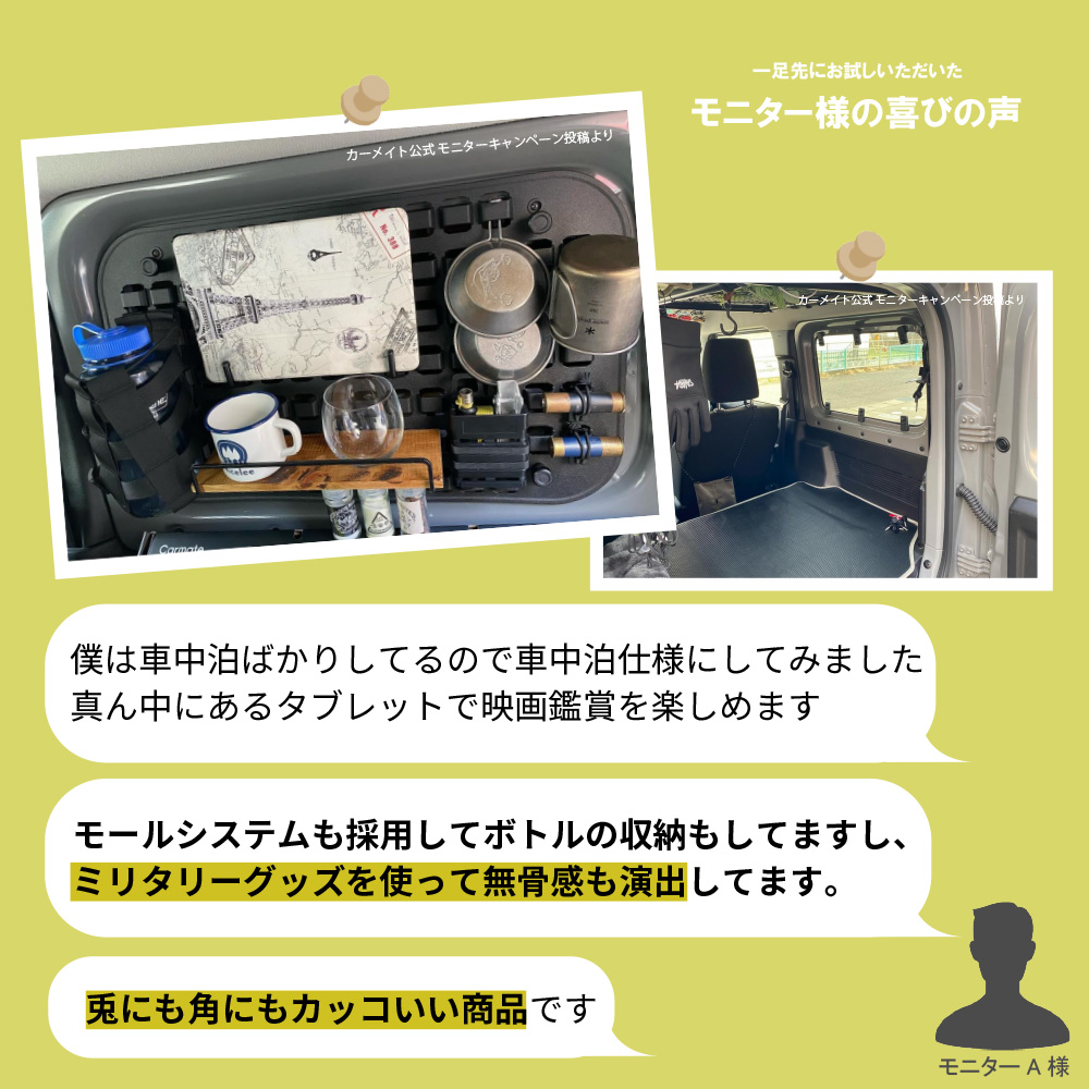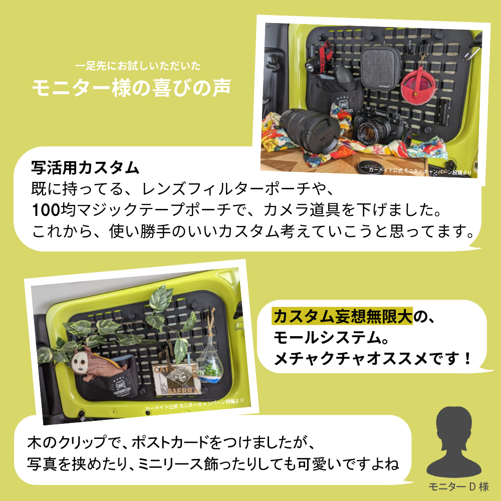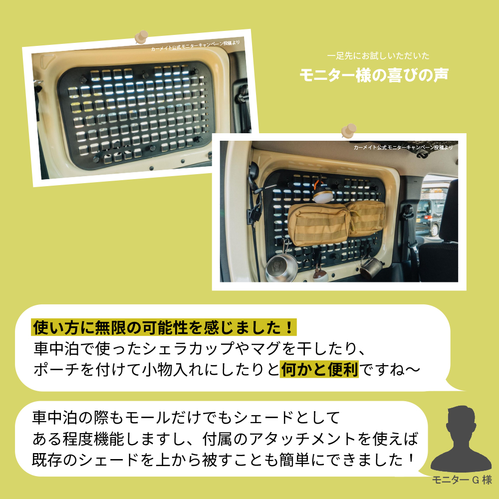 荷物の着脱や後方視界が気になる時、後部座席に人を載せるときなど、モールパネルの着脱がスムーズに行えます。
