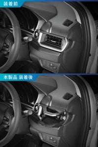 エアコンフィンの操作ノブを操作できるようにドリンクホルダー背面の形状を専用のデザインにし、ノブの操作を妨げない取付構造にしているのでエアコンフィンの向きを左右に調節できるようにしています。