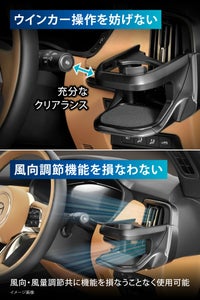 製品を取り付ける時にエアコンフィンを使用しないので、ドリンクホルダーを取り付けた後も風向きの調節ができます。また製品形状の工夫により、ドリンクホルダーを装着してもなるべく風を遮らない設計にしました。