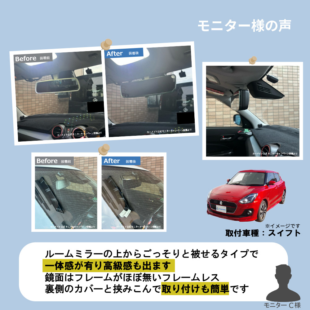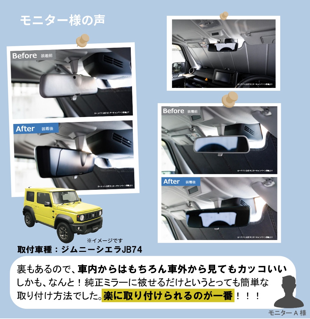 ・本製品は緩曲面鏡のため、純正ルームミラーとは映り方や距離感が異なります。