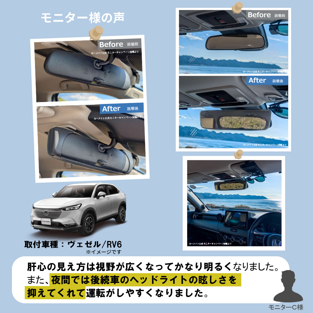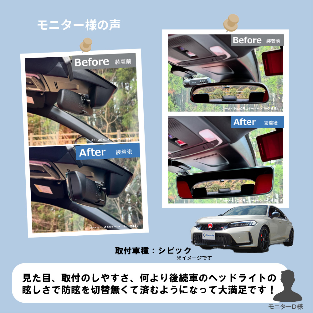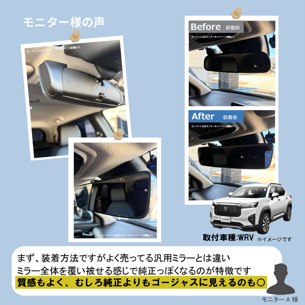・本製品は緩曲面鏡のため、純正ルームミラーとは映り方や距離感が異なります。
