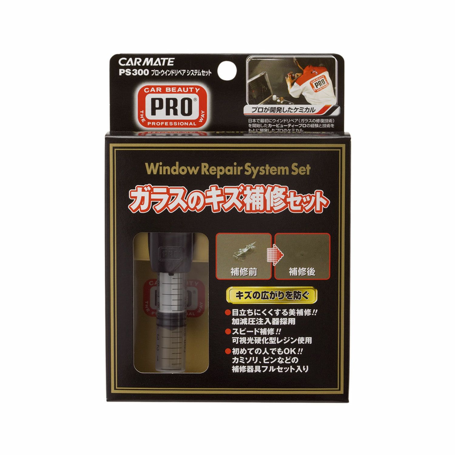 可視光硬化型レジン&加圧減圧注入器採用し、より美しいガラスキズの補修を実現。補修器具フルセット入り。