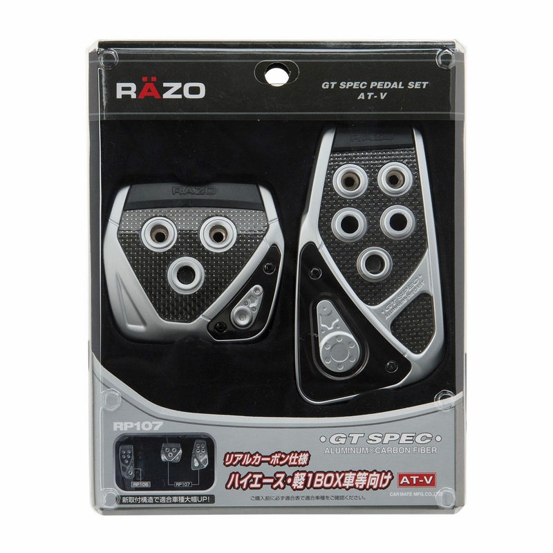 アルミダイキャストボディにカーボンファイバーを貼付けた贅沢な本格GTペダル。1BOX車向けATセット三次元ダイキャストデザイン。サイズ:アクセル132mm×71mm、ブレーキ80mm×85mm