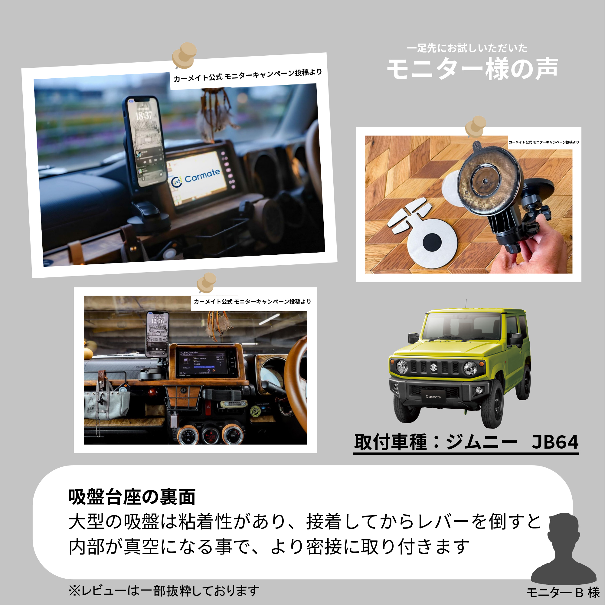 大型の吸盤と新規開発したサポート付きプレートの組み合わせによりダッシュボードへ強力に固定。