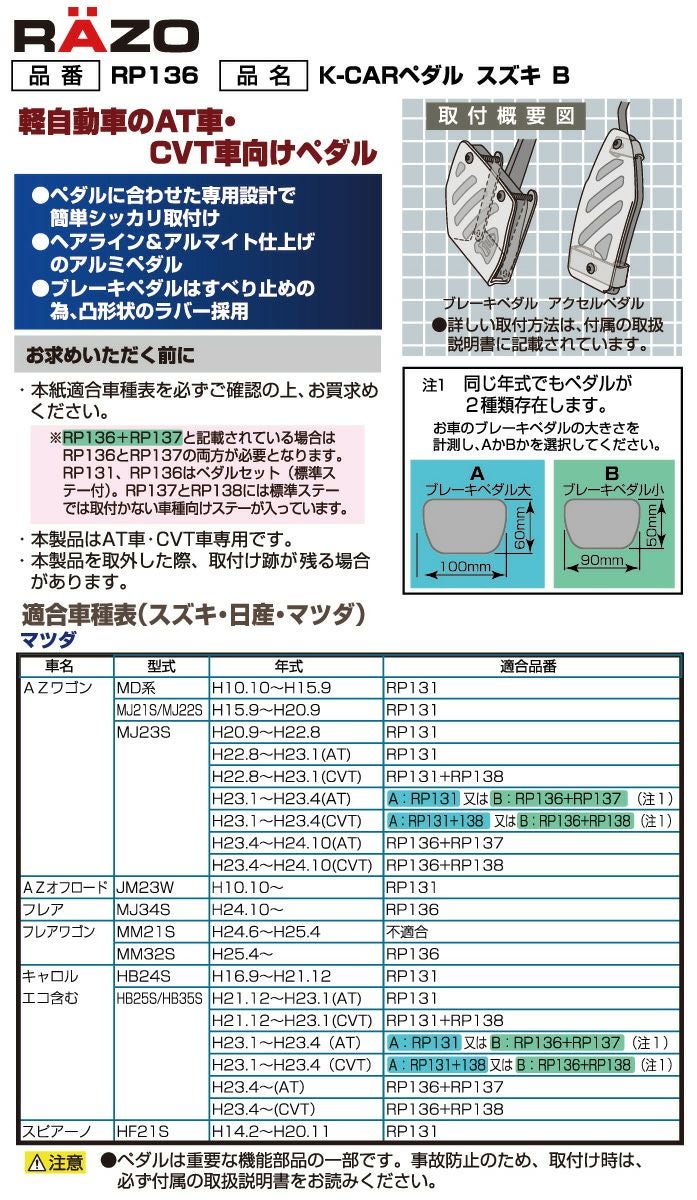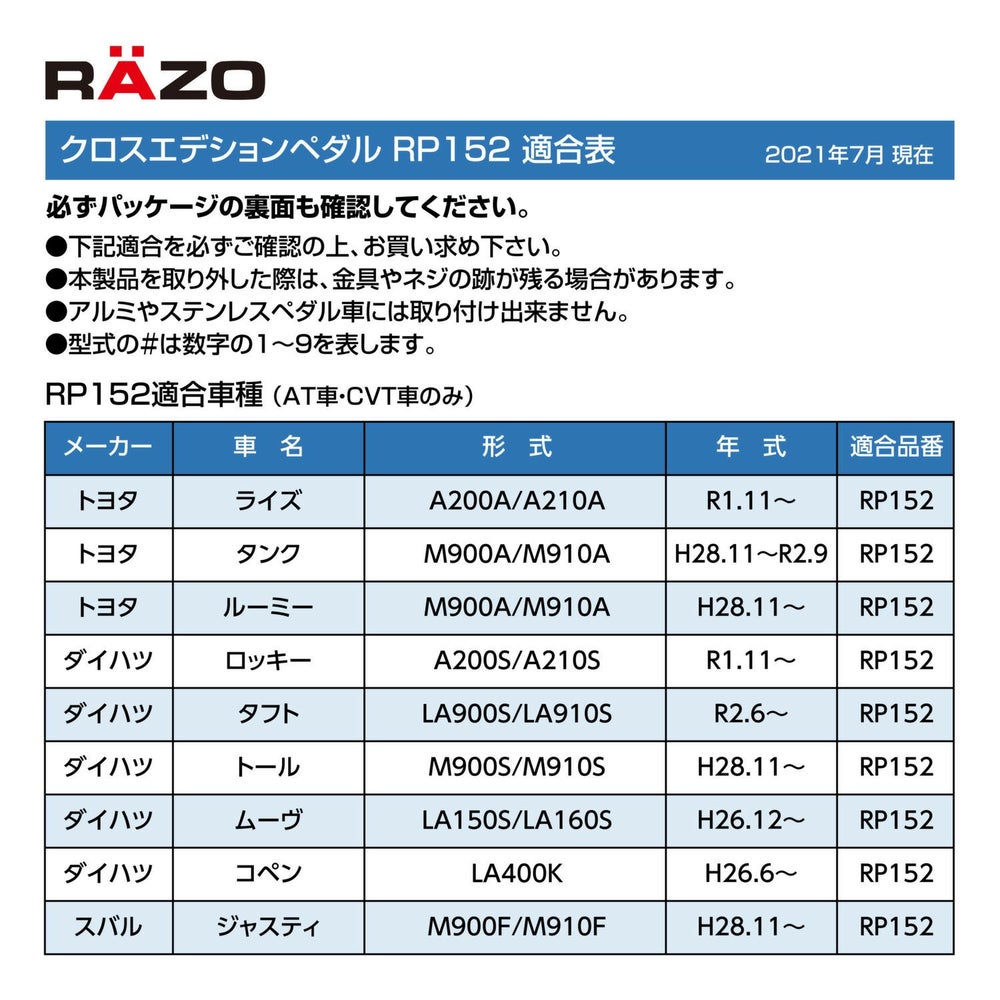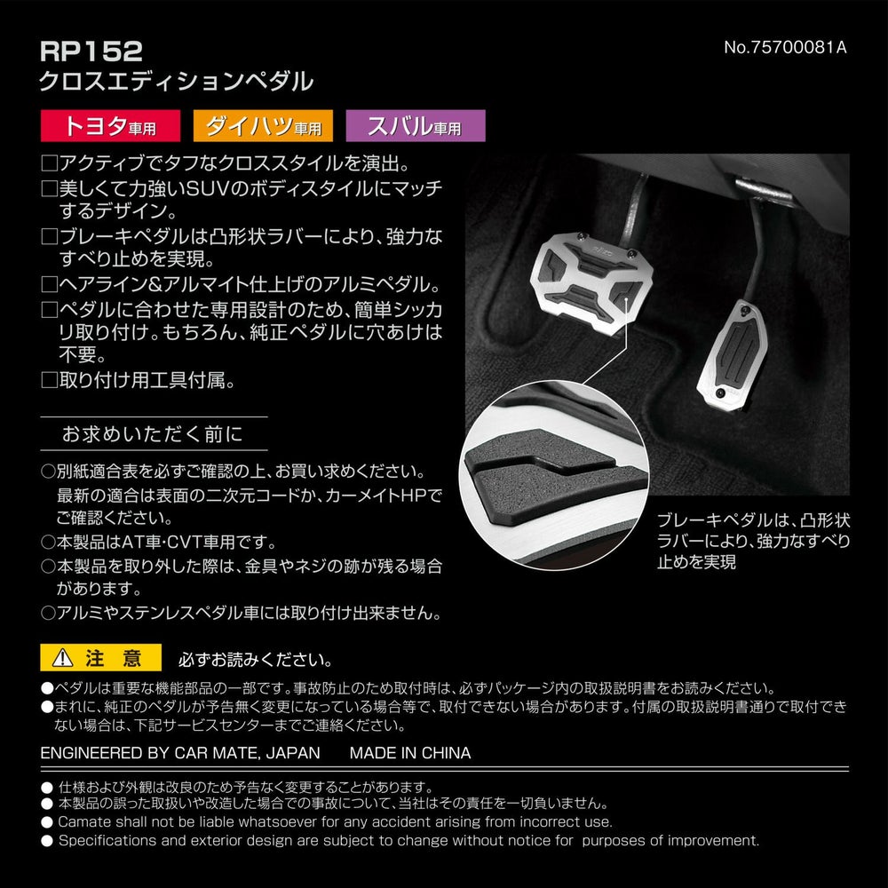 他の画像を見る アルミペダルでクロスオーバースタイルを演出! RP152 クロスエディションペダル トヨタ・ダイハツ・スバル車用 販売価格 ¥ 4,950 税込 流行のクロスオーバースタイルに最適なRAZOスポーツペダルが車種専用で登場 詳細を見る お気に入りに登録する