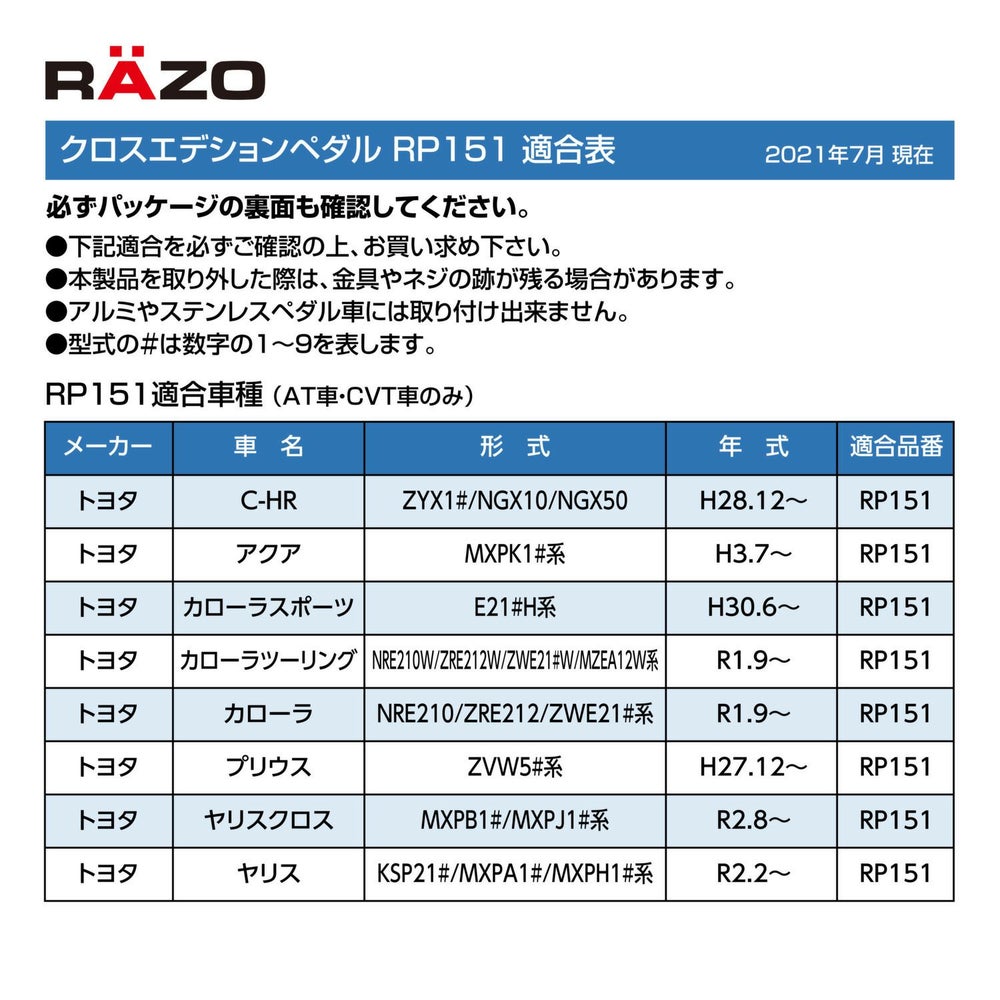 他の画像を見る アルミペダルでクロスオーバースタイルを演出! RP151 クロスエディションペダル トヨタ車用 販売価格 ¥ 4,950 税込 流行のクロスオーバースタイルに最適なRAZOスポーツペダルが車種専用で登場 詳細を見る お気に入りに登録する