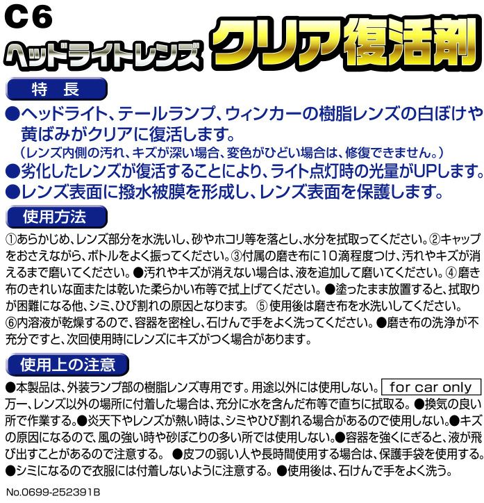 他の画像を見る ヘッドライトレンズをクリアに復活。 C6 ヘッドライトレンズ クリア復活剤 生産終了 販売価格 ¥ 1,046 税込 ヘッドライトレンズをクリアに復活。 詳細を見る お気に入りに登録する