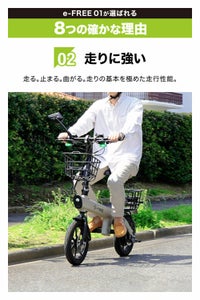 ――走りの基本を極めた走行性能。14インチタイヤが段差や荒れた路面でも安定した走りを実現。キックボードのような小さなタイヤと比べると安心感が際立ちます。直感的なアクセル操作で、思い通りの加速が可能。初めての方でも扱いやすく、日常の移動を快適にサポートします。漕がずに進む「特定小型原動機付き自転車」e-FREE 01 が、あなたの移動スタイルを変えていきます。