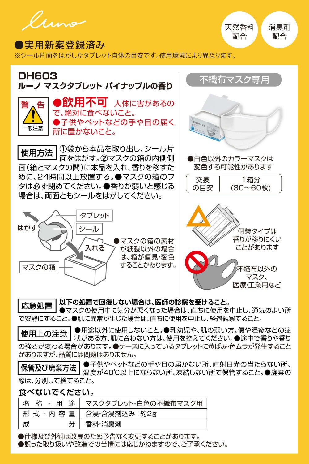 他の画像を見る 取り出した瞬間、マスクが香る DH603 ルーノ マスクタブレット パイナップルの香り ルート限定品 メーカー希望小売価格 ¥ 550 販売価格 ¥ 550 税込 取り出した瞬間、マスクが香る 詳細を見る お気に入りに登録する