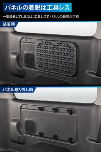 ・本製品は、後輪助手席側タイヤハウス上のユーティリティナット3か所へのネジ締結と両面テープによって車両へ取り付ける壁面収納パネルです。