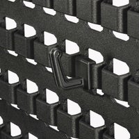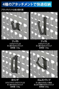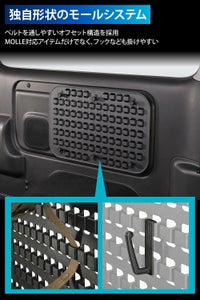 パネル本体はMOLLE(モール)システムに対応しており、MOLLE対応アイテムを自在に取り付けることが可能です。さらに、専用フックを4種×3個ずつ付属しており、工具や小物、バッグなどを掛けるだけで、機能的かつスタイリッシュな収納空間が完成します。使い方は自由自在です。